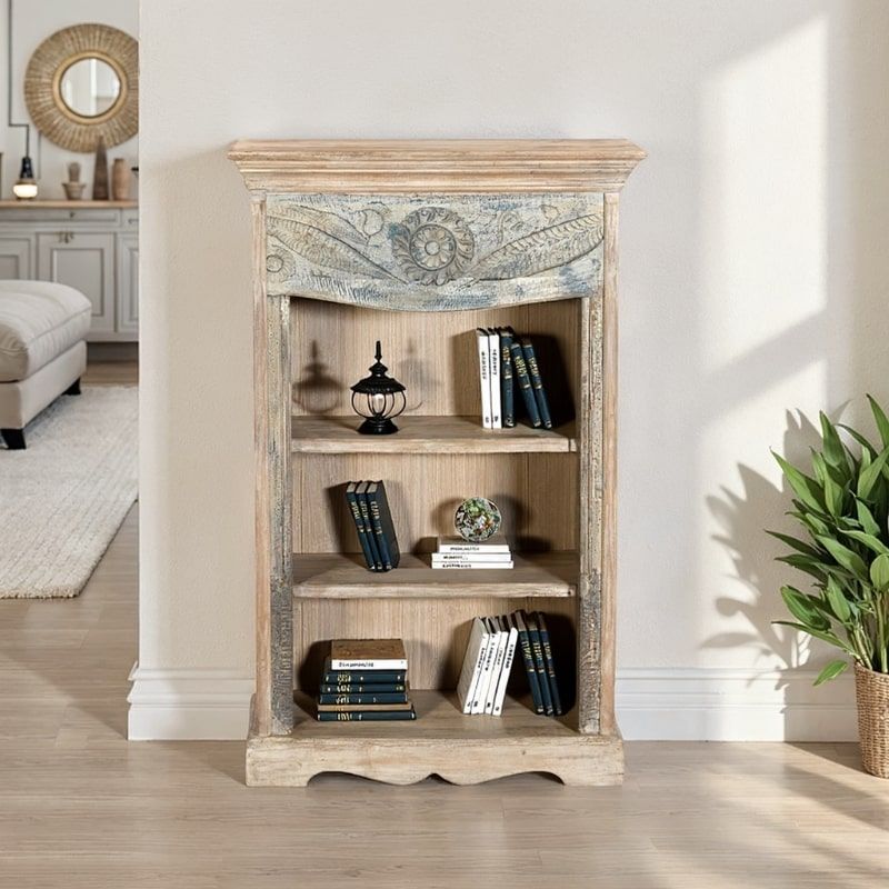 Cette bibliothèque indienne bois est une véritable pièce d’artisanat, fabriquée à partir d’anciennes frises indiennes soigneusement recyclées. Avec ses trois étagères fixes, elle offre un rangement pratique pour vos livres, objets décoratifs ou souvenirs tout en apportant une touche exotique à votre intérieur.