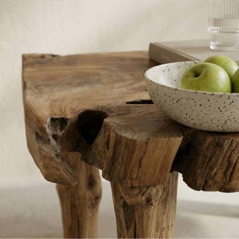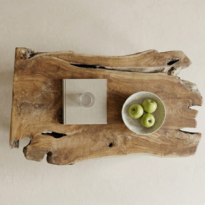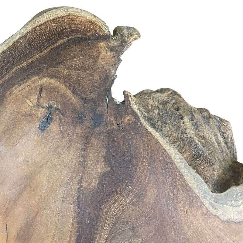 Apportez du caractère à votre décoration avec la table basse en racine de teck massif. Sculptée dans une tranche de bois naturel, chaque table est une pièce unique, aux formes et nuances différentes selon la racine d’origine. Son large plateau d’environ 90 cm met en valeur les nervures et reliefs du teck, pour un rendu à la fois brut et raffiné.